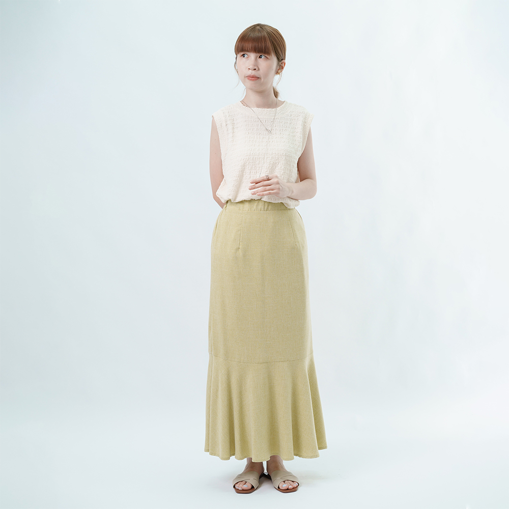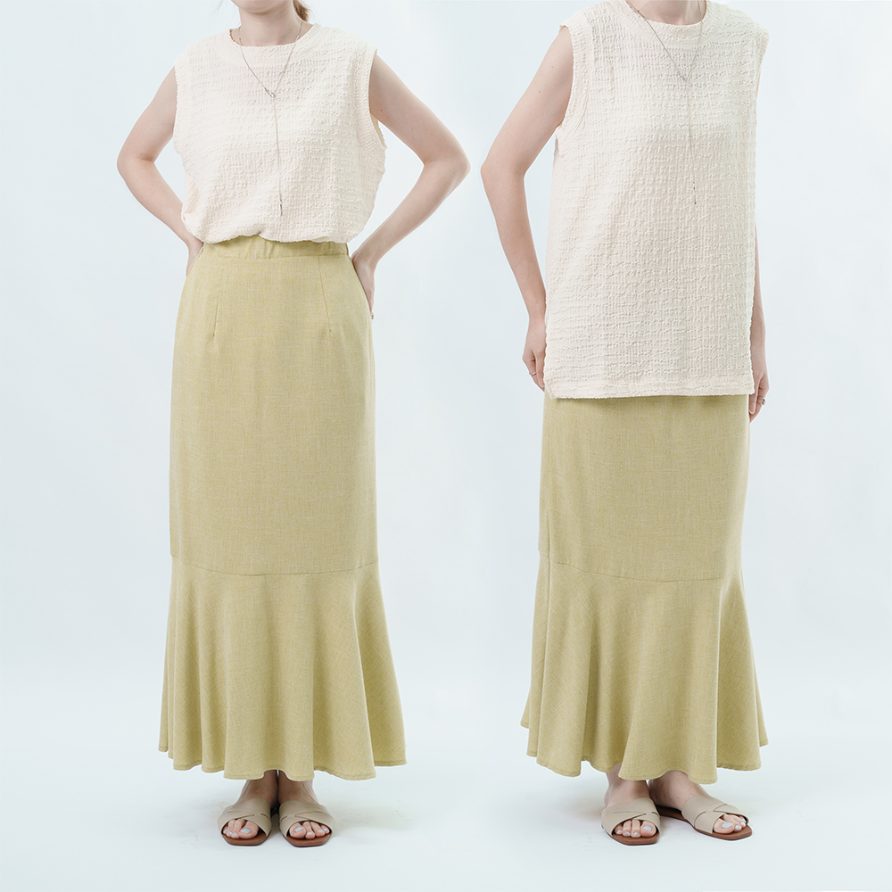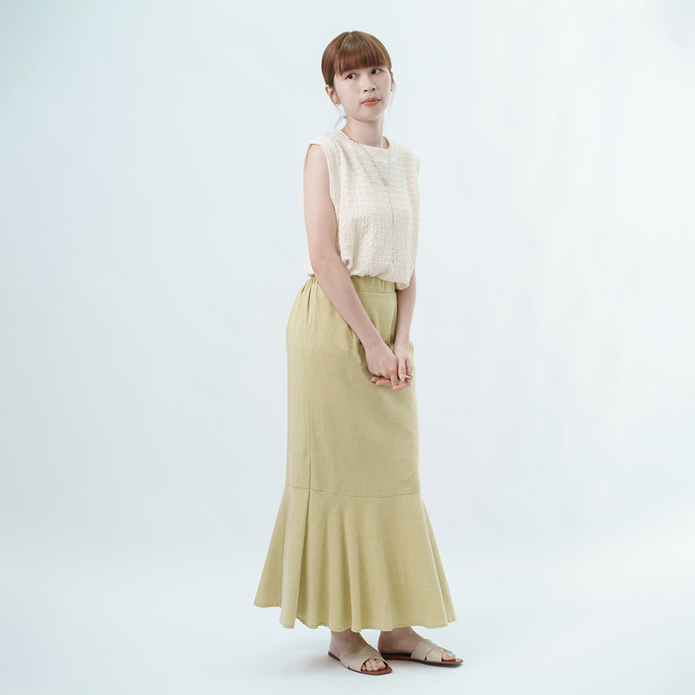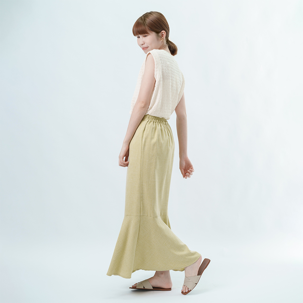 腰部的鬆緊線條延伸長腿 再以魚尾落下垂墜