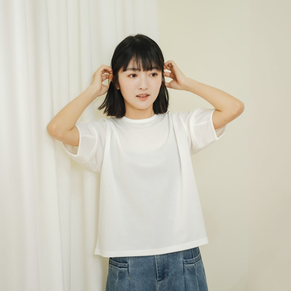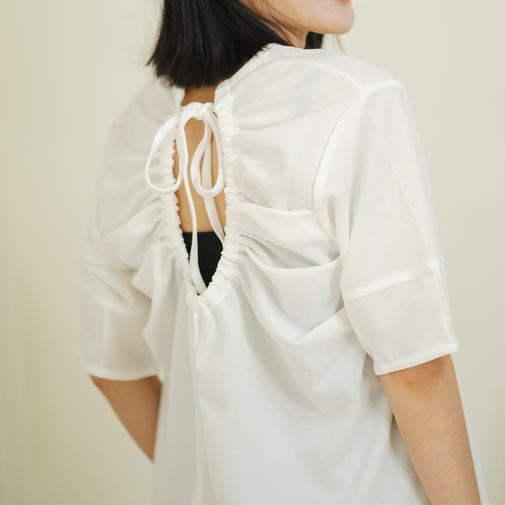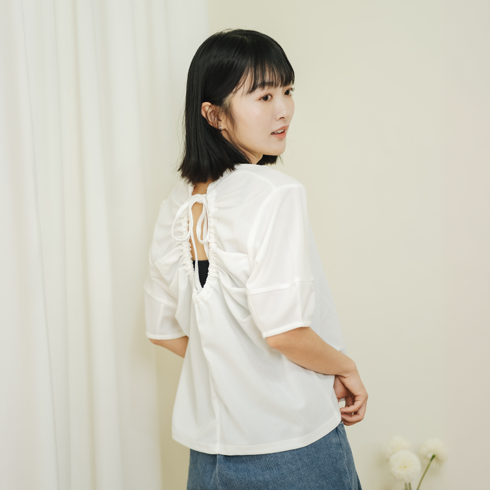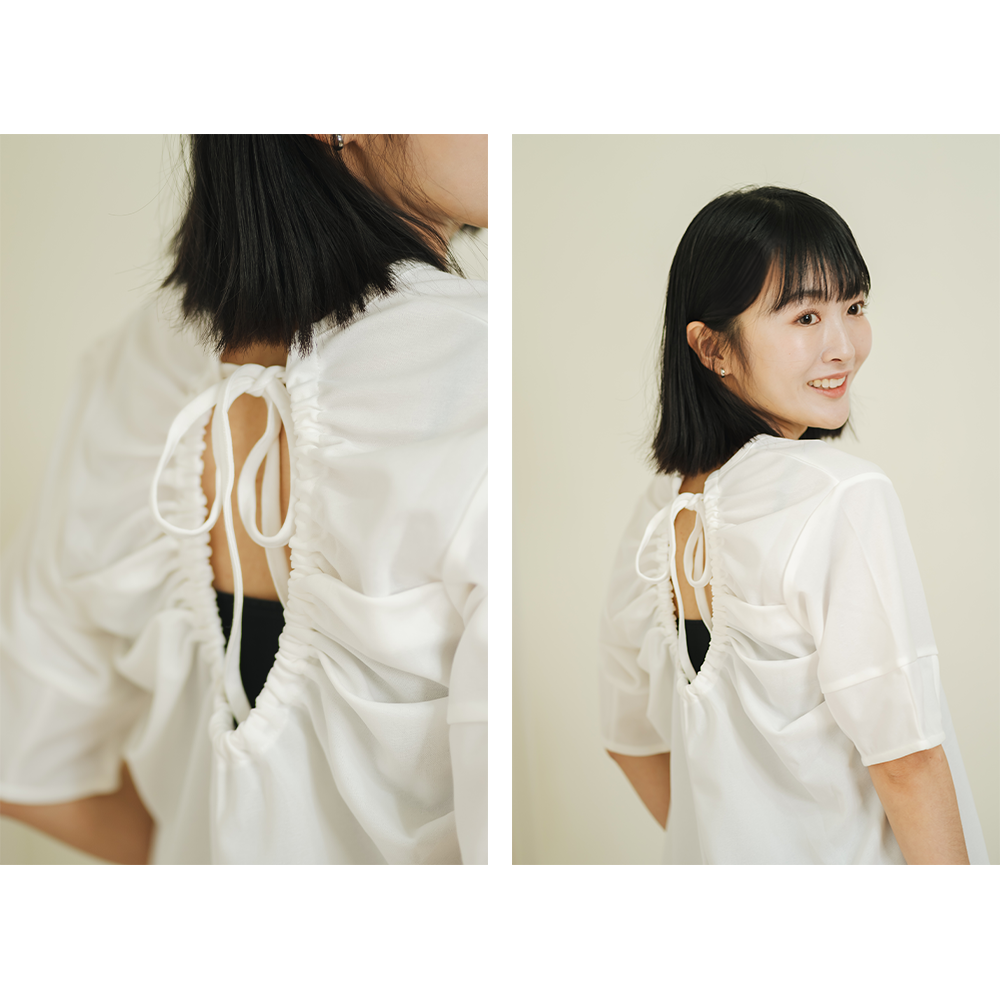 布料採表面細小凹凸觸感的切焦紗材料 有彈性、質量輕盈、不容易皺 正面經典素色百搭、袖子稍稍有圓弧澎度剪裁 轉到後面!後背藏有小小心機綁帶 દ ᵕ̈ ૩ 原來正面的簡單,是讓後背風格更明顯、展現大人感 ■ 尺寸:衣寬47cm / 肩寬36.5cm / 衣長56cm / 袖長21cm(人工測量存在±2cm誤差屬正常範圍) ■ 材質:聚酯纖維95% 聚氨酯5% ■ 顏色:白 ■ 實穿人員參考:馬各 154cm / 43kg ■ 日本空運回台,日本設計,中國製造